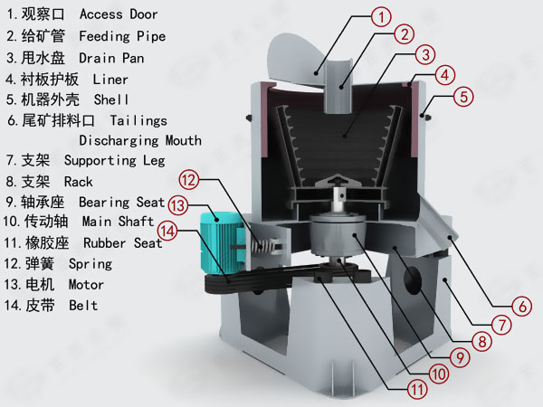 选矿离心机是由给矿管、机架、尾矿槽、驱动电机、主轴,反冲水管、精矿排料管,选矿部件等部分组成。